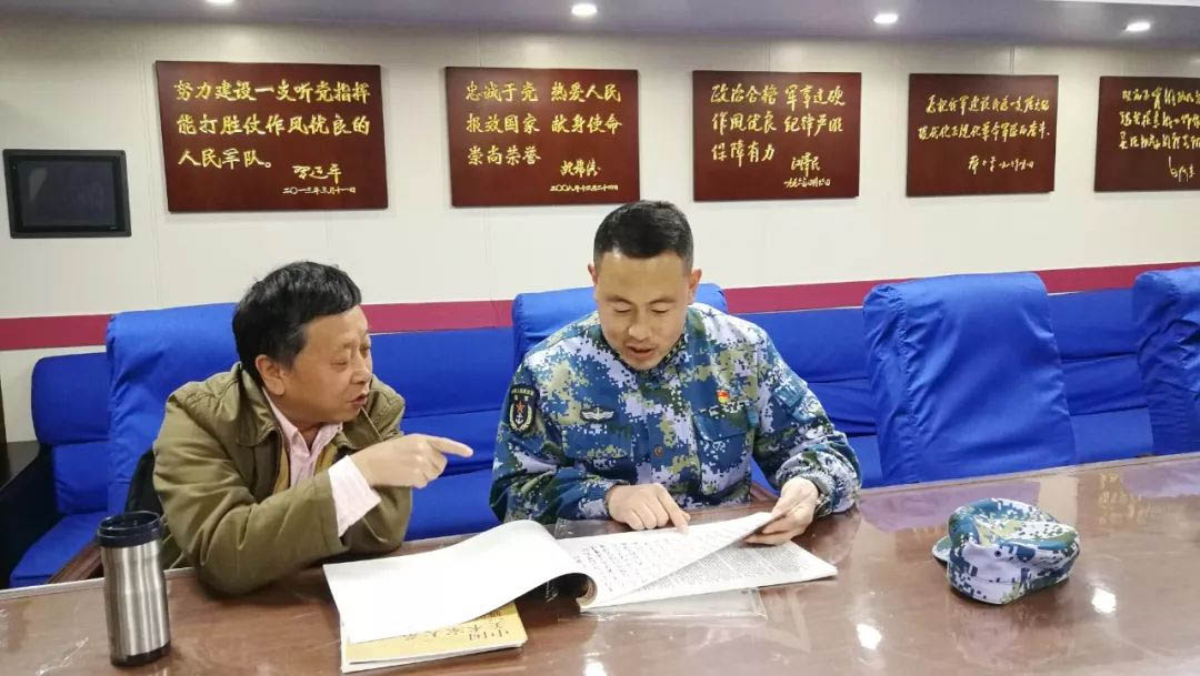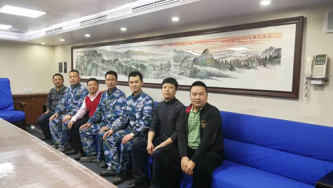姚叶红老师、“成都舰”首长、福宝印社工作人员合影于“成都舰”会议室 成都这座历史悠久的文化名城,有众多驰名中外的自然风光和名胜古迹,是古蜀国的发祥地、中国十大古都之一、我国西部地区的中心城市。为了突显“成都”舰的成都特色,部队首长对《天府之源》作品的创作高度重视,曾数次来成都与画家交流,商谈创作的题材与形式,即如何在4.8米长x0.5米高的尺幅上,将成都的美展示出来,以更好的激发广大官兵热爱家乡、保卫祖国的革命热情。