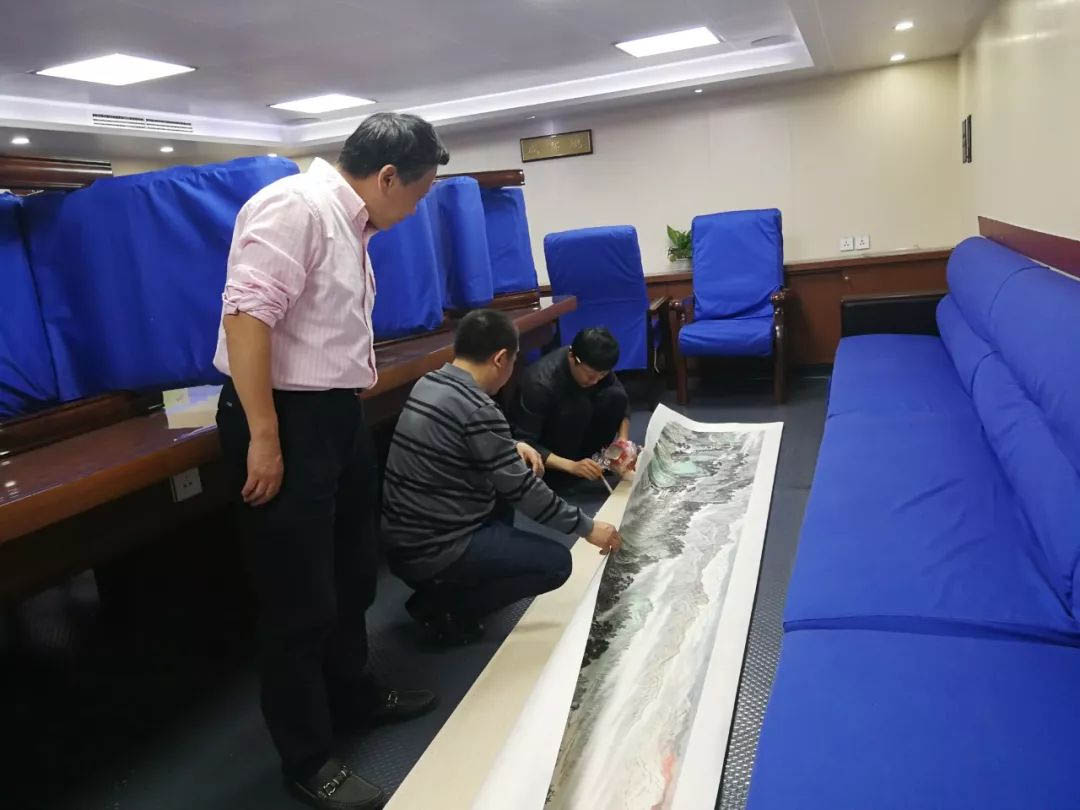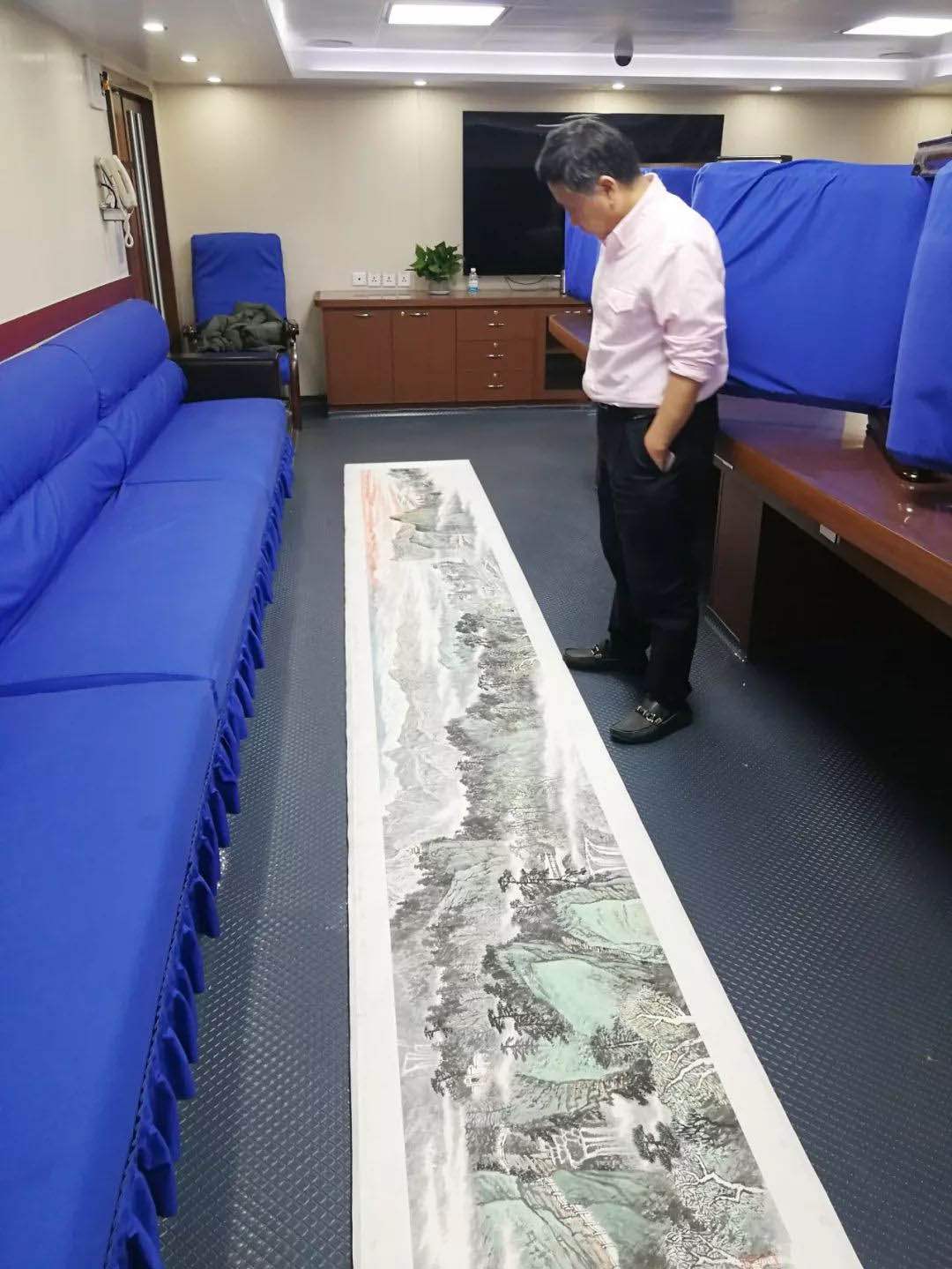 装裱师傅精心装裱安装 正是这样发自内心的真情流露和全力以赴的倾情付出,使他创作出了一幅礼赞英雄,歌颂祖国,气势恢宏,波澜壮阔的作品,为四川美术赢得了荣誉! 著名书画家徐有中先生为姚叶红老师在海军成都舰画川中山水有感致贺: 一幅丹青写蜀山,成都舰上系乡关。 战旗猎猎军容盛,万里海疆震敌顽。