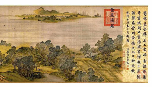 《千里江山图》,北京故宫博物院馆藏珍品。绢本,设色,纵51.5厘米,横1191.5厘米,为中国北宋青绿山水画作品。作者王希孟。王希孟18岁为北宋画院学生,後召入禁中文书库,曾得到宋徽宗赵佶的亲自传授,半年後即创作了《千里江山图》。惜年寿不永,20馀岁即去世,是一位天才而又不幸早亡的优秀青年画家。