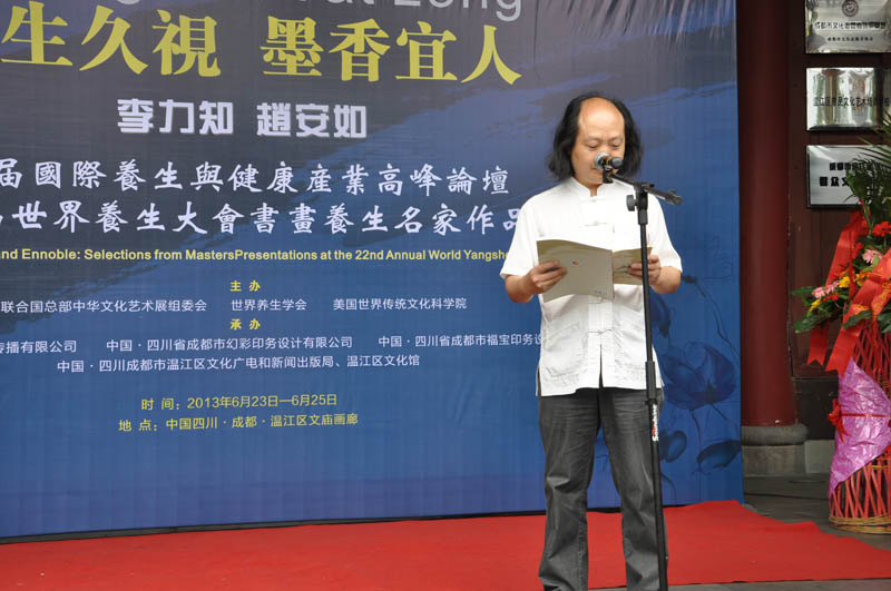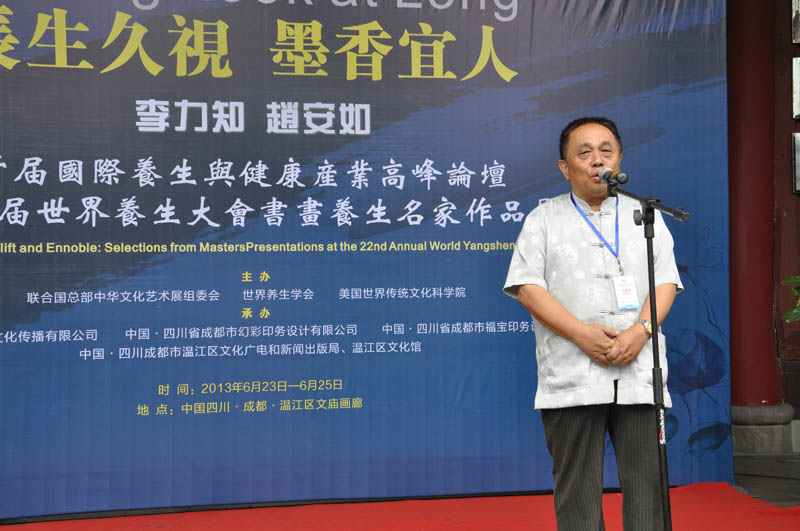 首届国际养生与健康产业高峰论坛及第22届世界养生大会于2013年6月21日至30日在成都中医药大学举行,在此推举出两位当地著名书画家李力知、赵安如先生。他们的作品作为这次大会书画养生的示范作品,有着不同寻常的历史意义和现实意义。 6月23日上午11:30,“长生久视·墨香宜人”首届国际养生与健康产业高峰论坛第22届世界养生大会书画养生名家李力知、赵安如作品展,在天府之国的腹心中国四川成都市金温江的文庙画廊隆重开幕,同时,《“长生久视·墨香宜人”首届国际养生与健康产业高峰论坛第22届世界养生大会书画养生名家李力知、赵安如作品集》由美国世界传统文化科学院正式出版问世。出席开幕式的有联合国总部中华文化艺术展组委会主席、美国世界传统文化科学院院长、世界华人组织联盟主席、 纽约州立大学中华文化艺术馆馆长张元明教授,成都中医药大学和养生中心的领导等国内外的养生专家学者、企业家、收藏家和四川省、成都市、温江区有关领导嘉宾,首届国际养生与健康产业高峰论坛第22届世界养生大会的代表们,以及文学艺术界的艺术家朋友们数百人。 这次展览由联合国总部中华文化艺术展组委会、世界养生学会、美国世界传统文化科学院联合主办,中国四川省福宝斋文化传播有限公司,中国四川成都市幻彩印务设计有限公司、中国四川省成都市福宝印务设计有限公司、中国四川成都市温江区文化广电和新闻出版局、温江区文化馆共同承办。 李力知先生是一位思想敏锐,不断实践的艺术名家,他曾从事中国尖端科学的研究,同时又在多学科进行了综合研究。他提出了中国山水画“西宗”;总结了自己的艺术体系“青城玄墨”,这些学术论点作为专著付梓出版引起了同行的关注。 此次书画展览,力知先生提供了三十余幅中国诗圣杜甫在1200年前,歌咏成都西郊自然风光的诗意画。这是他花数年时间,通读了这位诗人作品后精选出来的。杜甫不仅是中国文学史上的诗圣,并且也是熟悉中草药,是种植中草药的高手,换而言之,杜甫是通过它的诗意创作,抒发了他的爱国热情,达到了他精神养生的目的。同时,通过种植中草药以及使用,又起到了药养的功效,力知先生这种感悟,缘于他居住在草堂不远的地方,时时能与诗圣“对话”。 21世纪全球要建设生态文明,而生态文明包括三大内容:即自然生态;社会生态;以及精神生态。然而这三种生态文明,我们都能从杜甫的诗中找到积极、健康的基因,对这些基因,已经过千年实践的检验后并加以弘扬,是当今艺术家的责任! 赵安如先生是具有创新精神和个性特征的实力派艺术家。从小在儒雅的环境中成长,酷爱书法,并且有幸得到蜀派书法大家的指导,因此,艺术精进。他热心社会公益和书法善举,早已被推举为四川省书法家协会理事、四川省硬笔书法家协会副主席、成都市书法家协会副主席、四川省科学养生书画院艺术总监。在成都电视台举办的“养生栏目”中,特将他的书法“养”字,作为栏目背景。这次展览,他将近年来的书法力作三十余幅奉献出来展示。这些书法中所陈述的中国古代圣贤的诗文,尤其是养生禅诗,如果我们仔细咀嚼能感受到中国文化的核心价值,这种价值对于陶冶情操,精神养生大有裨益。 中华民族有着悠久的历史,中国书画是其国粹。中国书法已被联合国列入世界非物质文化遗产名录,中国画在世界美术中占有重要的一席之地。以中国书画为代表的东方文化对世界有重要影响力,对人类文明作出了不可磨灭、不可替代的历史性贡献。而当今世界养生论坛推出的李力知、赵安如书画养生精品力作,以其艺术公益性和世界普适性,便于在全球推广普及,将惠及数十亿地球村民。 世界博爱求大同,东方墨香宜养生。我们深信,随着时间的推移,古老的东方文化艺术智慧必将照耀未来世界,向生态文明升华! 这次展览由张元明教授总策划,由书画大家向维果、谢季筠先生担纲艺术总监。同时,还有2005年由张元明主席在联合国总部推出的华人艺术家第一人中国画大家白庚延教授,军旅书画家谭晓明等书画名流的精品力作亮相助阵,举行现场互动交流,可谓好戏连台。 展览向公众免费开放,将于6月25日闭幕。