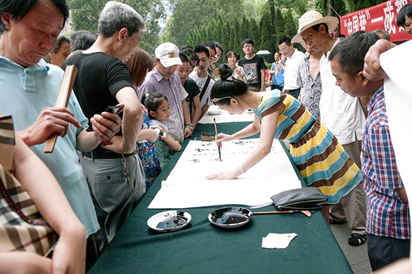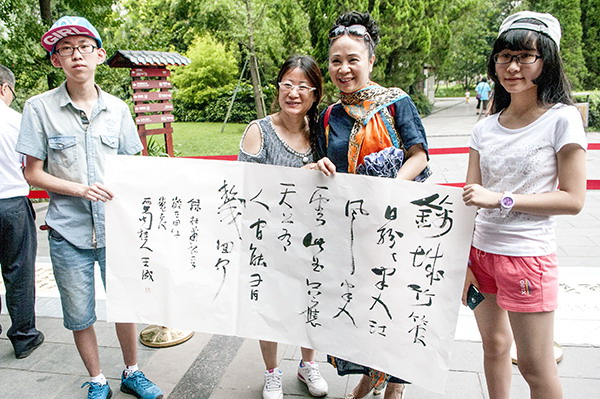 艺绽芙蓉地,花重锦官城。7月17日上午10:00,由成都市文联主办、成都市书法家协会承办的“中国梦”成都书法百人百米长卷创作展示活动,在人民公园纪念碑广场隆重举行。 17日上午,来自全市的书法家和书法爱好者群贤毕至,汇聚一堂,俊彩星耀。100名参加书写的作者现场挥毫泼墨,满腔热情书写我们心中的“中国梦”,吸引数百市民和游客观看。大家通力协作,一次性完成100件“中国梦”主题书法作品。同时展示了“中国梦”成都书法百人百米长卷,并发行作品集,把活动推向高潮。现场充满“文化之都”翰墨飘香的祥和气氛,得到各方好评。书法家们还将现场创作的作品赠送给喜欢书法的群众,受到热烈欢迎。 百人百件小作品融合为100米“中国梦”书法长卷,其书法集体创作规模创成都之最,堪称书坛盛举。放眼长卷,但见妙构佳作迭出,神彩飞扬,美轮美奂,和而不同。既在坚守传统中传承,又在创新式样中发展;既有碑学的苍劲朴茂,又有贴学的钟灵毓秀;既有成都书法特色,又有当下时代精神;“真草篆隶行”共奏和谐华章,“诗词歌赋文”齐颂盛世中华。可谓人文荟萃,城市心声,值得大家品读。 这次活动从2014年初开始精心策划筹备。4月,通过媒体向社会公布活动讯息后,引起社会各界的广泛关注,得到了广大书法家和书法爱好者的积极响应;5月,成都市书法家协会公布参与活动人员名单,要求参与活动人员进行前期文字内容创作,力求主题突出,歌颂时代,书写成都;6月,参与活动人员将自己创作的文字内容及书写小样交市书协审查,经审查合格后备用,最终确定正式参加书写百米长卷的作者100名。 据了解,成都市书协举办的此次活动,旨在认真贯彻落实党的十八大、十八届三中全会和习近平总书记关于“中国梦”的重要讲话精神,践行社会主义核心价值观,繁荣成都书法艺术,提高成都书法水平,扩大成都书法的影响力。“中国梦”成都书法百人百米长卷将用于公益文化活动的巡回展示,并向新中国成立65周年献上书法人的祝福!(文/成都市书协 图/赵立)
