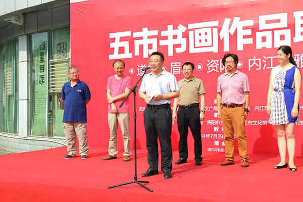 7月29日上午,为隆重庆祝建国65周年,共同促进遂宁、内江、资阳、眉山、雅安5市书画艺术的繁荣与发展,进一步加强5市的交流与合作,“遂宁、眉山、资阳、内江、雅安美术书法作品五市联展”在遂宁市美术馆隆重开幕。省文化馆何光伦馆长宣布开幕,遂宁市文化广播电影电视局局长勾中进致辞。此次美术书法作品联展于2014年8月—12月在5市轮流举办。 遂宁文化有着深厚的历史传统和人文基础,先后被命名为“中国民间文化(诗画)之乡”“中国民间文化(书法)之乡”。近年来,在遂宁市委、市政府的关怀下,在社会各界的支持下,在广大美术工作者的共同努力,遂宁书画事业充满了生机和活力,呈现出繁荣发展的良好局面。据悉,目前,遂宁有国家级美协会员5人、省级78人、市级350余人;国家级书协会员20余人、省级40余人、市级300余人,形成了一批既有地域特色,又有较高艺术水平、在省内外具有较大影响力的书画家群体,为丰富人民群众精神文化生活发挥了积极作用。5市书画创作成果的巡礼,首站选择在遂宁,将150余副精品力作奉献给遂宁广大人民群众,这是对遂宁文化建设努力的肯定,是5地文化交流的又一实践,彰显了5座文化大市的深厚底蕴,展现了5地书画艺术家的豪迈激情。此次展览的成功举办必将推动5地文化交流向纵深推进,助推“大成都”区域文化事业又快又好发展。 随着物质生活的不断满足,人民群众越来越期待欣赏更多有思想深度、有时代高度,能够弘扬民族精神和时代精神的书法美术精品,这对书画工作提出了更新、更高的要求,与会领导希望遂宁市美术馆不断提高策展、办展水平,希望5市的书画名家们创作出更多更好的书画精品,并在更多的城市开展更加广泛的文化交流与合作。 开幕式后,还在遂宁市文化馆举办了5市文化馆书画笔会交流活动。