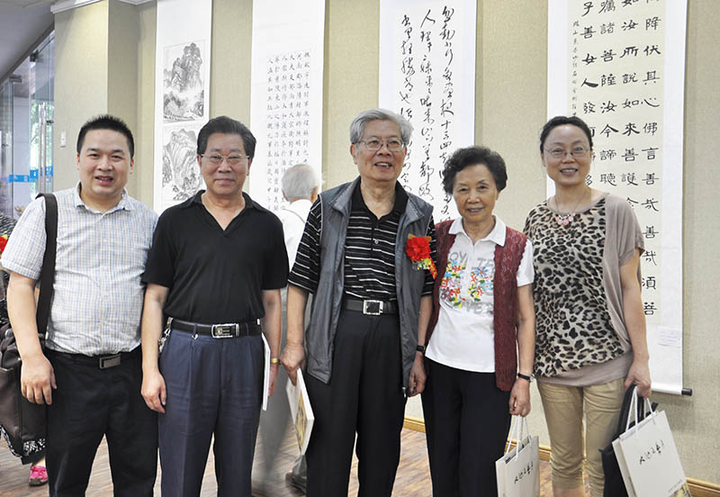 四川省福宝斋文化传播有限公司经理向运成(左1)与四川省政协原副主席章玉钧(中)、四川省老干局原副局长、大地书画院院长胡国明(左2)等在展览现场合影
