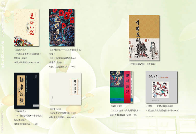 王双才学术成就: 《双才写戏.戏剧人生》(中国天彭牡丹诗书画院/ 2005) 《画里有话》(四川美术出版社/ 2007) 《读画说戏》( 四川出版集团/ 2011 - 07) 《罗汉春秋图》(福宝印务设计有限公司/2009) 《观图说戏》(王双才绘图・黄光新等撰文/四川美术出版社/ 2000 - 09) 《双才墨道》(中国文化出版社/ 2012 - 02) 《墨戏人间》(中国文化出版社/ 2012 - 08) 《美哉川戏》(中国文联出版社/ 2012 - 11) 《纵情:王双才歌舞画集》(成都鼎艺文化公司/ 2013) 《彭州国色——王双才牡丹作品专集》(中国文联出版社/2013 - 08) 《家乡美》(向氏文化传播有限公司/2013) 《蜀中三怪》(成都鼎艺文化传播公司/成都画院/ 2013 - 01) 《中国京剧史画》(待出版)