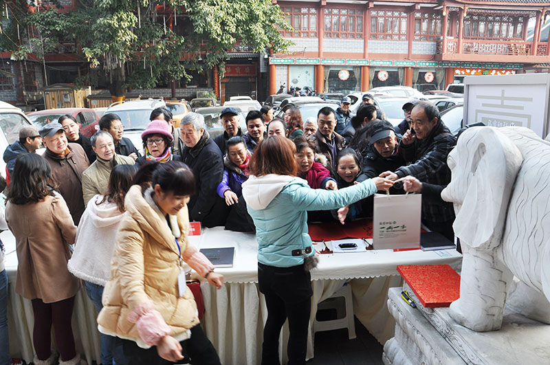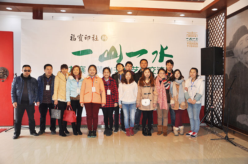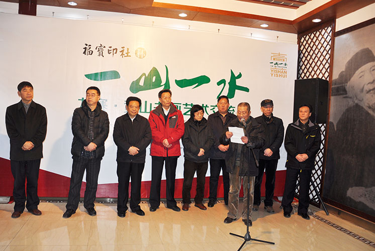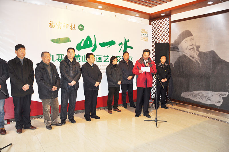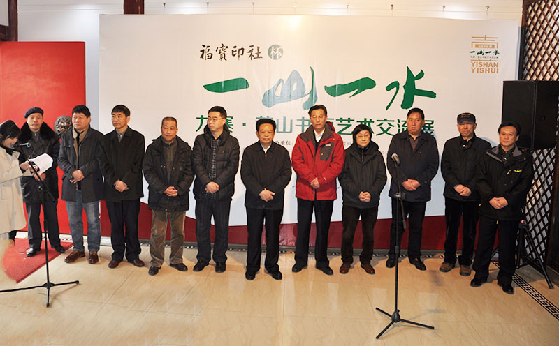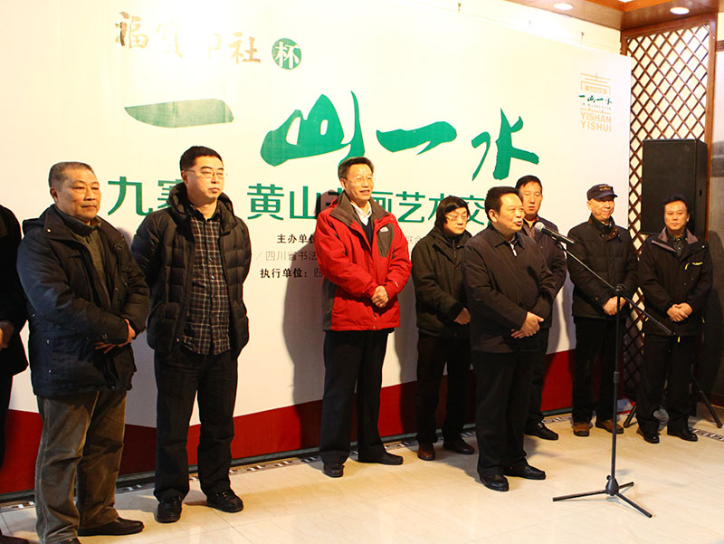 2015年2月5日,“福宝印社”杯“ 一山一水”九寨黄山艺术交流展在成都怀古堂美术馆隆重开幕。 参加此次开幕式的嘉宾有: 四川省文联党组书记 蒋东生先生 四川省美协主席 阿鸽女士 四川省美协常务副主席兼秘书长、四川省美术馆馆长 梁时民先生 四川省美协副主席 武海成先生 四川省书协副主席兼秘书长 戴跃先生 四川省书协副主席、四川省文化馆馆长助理 林峤先生 四川省书协副主席 钟显金先生 四川九寨沟管理局原局长、阿坝州政协副主席 章小平先生 黄山管理局副书记 范清棠先生 黄山管委会党委委员、政治处主任 程光华先生 黄山管委会党委委员、规划土地局局长 刘一举先生 四川天骄大熊猫画院院长、四川九寨画院院长 童昌信先生 黄山画院秘书长 关德军先生 四川省文史馆文史处处长 陈沫吴先生 四川省文史馆文史处副处长 伍文先生 巴蜀画派促进会秘书长 李杰先生 四川省收藏家协会副秘书长 田伟先生