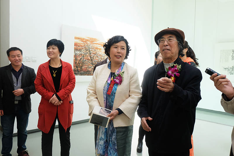 开幕式结束后,四川省美术家协会常务副主席、美术馆馆长梁时民先生,四川省美术家协会副主席、省诗书画院副院长管苠棢先生,四川中国画学会常务副会长、成都画院学术委员会主任叶瑞昆先生,省诗书画院专职书法家冷柏青先生与印制此次画展画集的福宝印社经理向运华、向运成合影