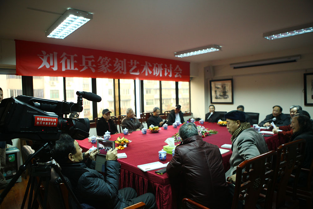 2015年12月19日,“刘征兵篆刻艺术研讨会”在福宝印社艺术沙龙召开。出席研讨会的有书画篆刻界、学术界的专家、学者和收藏家、企业家及刘征兵的学生等。其中有:著名书法家、原四川省书协副主席刘奇晋,著名书法家、四川省书协副主席徐德松,书法篆刻家、开明印社社长吕清平,古籍版本学者、原成都古籍书店总经理张启政,诗人、书画家高维州、苏凤智,书画家、四川省书协理事袁己山,书法家张勉之,原青羊区副区长陈旭畅,篆刻家周正元、姚子,书画评论家刘粮库。研讨会由文化学人、书法篆刻评论家谢凡耿主持。与会专家、学者对刘征兵篆刻艺术各抒己见,刘奇晋、徐德松、吕清平、张启政、高维州、袁己山、苏凤智、陈旭畅、周正元等近二十人相继发言,对刘征兵的艺术成就高度赞赏。 研讨会上,中国画院副院长王忠民委托其成都学生送来鲜花表示祝贺,并发来贺诗,诗曰: 名师陶铸灿春阳,半世清寒老更香。 德缘太岳坚丰骨,艺汲岷水涌灵光。 挥刀有胆开今古,运毫无意炫华章。 小拾散珠成一缀,翰墨巴蜀又一墙。 刘征兵,著名书法篆刻家。1949年9月出生,河北晋州人。刘征兵出生于燕赵大地,成长、成名于蜀中锦城。1970年入伍,早年习书习画,师从蜀中著名画家曾尧、著名书法篆刻家游丕承,后专攻书法、篆刻。大专汉语语言文学专业。数十年挥毫操刀,治印数以万计。1970年代即开始在《书法报》《书法导报》《书法》杂志等全国专业报刊发表作品。澳门《印缘》杂志多次刊载其印作。作品曾入选中国书协“全国第一、第三届篆刻艺术展”、“全国第三届中青年书法篆刻展”、“全国第四届书法篆刻展”、“西泠印社第二届全国篆刻评展”、“全国印社团体展”、四川省及成都市多届书法篆刻展和省际、市际以及日本、韩国、新加坡、港澳台等海外书法篆刻展。在艺术创作的同时,致力于古文字研究和篆刻教学,讲授篆刻学、篆刻史、篆刻技法、篆刻欣赏、古文字学基础等课程,培养了一大批篆刻爱好者和篆刻家。历任四川省书协历届篆刻展评委、四川省青少年书法段位评委、中国石油书协大展赛评委、四川省中青年篆刻研究会副会长、开明印社社长。现为中国书协会员、四川省书协篆刻委员会副主任。篆刻委员会副主任。《刘征兵篆刻》作品集已于2015年11月出版。 刘征兵治印从古玺汉印入手,打下了扎实的根基。其从古玺印及明清流派印中广泛汲取营养,既恪守传统又因势创新。善于以传统驾驭创新,在几十年的艺术实践中,在传统与现代之间找到融合的节点,从而形成自己独特的篆刻风貌。其印作,大气磅礴中不失精细,雄健豪放中蕴含秀润。章法张驰有度、布白有绪。字法探究来源、择用有自。刀法劲健爽利、干脆明快。其白文印的单刀技法利落精致,能体现出一种新的篆刻思想理念和境界。刘征兵的篆刻体现出很高的艺术造诣和内含。几十年来,刘征兵认真为艺,低调谦和,既秉承豪爽旷达的燕赵遗风,又饱含细腻温婉的天府情怀。对同道、对朋友、对学生向来以诚相待、以德相交、博得一致的称道赞誉。 研讨会持续近三个小时,最后,主持人谢凡耿以其在编辑《刘征兵篆刻》作品集时所赋一诗作为研讨会的结语: 燕赵儿男燕赵风,慷慨一仍燕赵雄。 巴蜀山水润秀色,敢令昆刀夺天工。