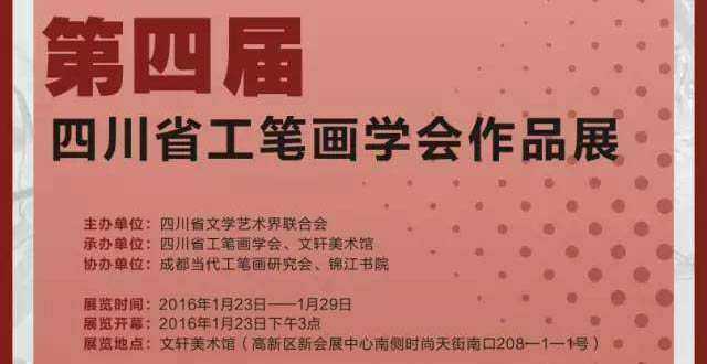 主办单位:四川省文学艺术界联合会 承办单位:四川省工笔画学会 文轩美术馆 协办单位:成都当代工笔画研究会 锦江书院 支持单位:四川省福宝斋文化传播有限公司 展览时间:2016年1月23日—1月29日 开幕时间:2016年1月23日下午3点 展览地点:文轩美术馆