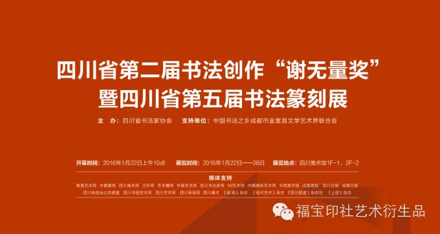 主办单位:四川省书法家协会 支持单位:成都市金堂县文学艺术界联合会 开幕时间:2016年1月22日上午10点 展览时间:2016年1月22日——31日 展览地点:四川美术馆1F-1、2F-2 媒体支持: 雅昌艺术网 中国美网 四川美术网 文轩网 艺术圈网 华夏艺术网 四川书法家网 99艺术网 中国原创艺术网 华西都市报 成都商报 四川日报 成都日报 四川电视台公共频道 四川书画艺术网 四川艺术网 四川新闻网 四川美术 《读城》杂志 《现代艺术》杂志 《四川报道》杂志社 《上层》杂志