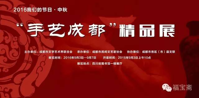 主办单位:成都市文学艺术界联合会 承办单位:成都市民间文艺家协会 协办单位:成都市各区(市)县文联 展览时间:2016年9月3日—9月7日 开幕时间:2016年9月3日上午10点 展览地点:四川省图书馆一楼展厅(四川省成都市青羊区人民西路4号)