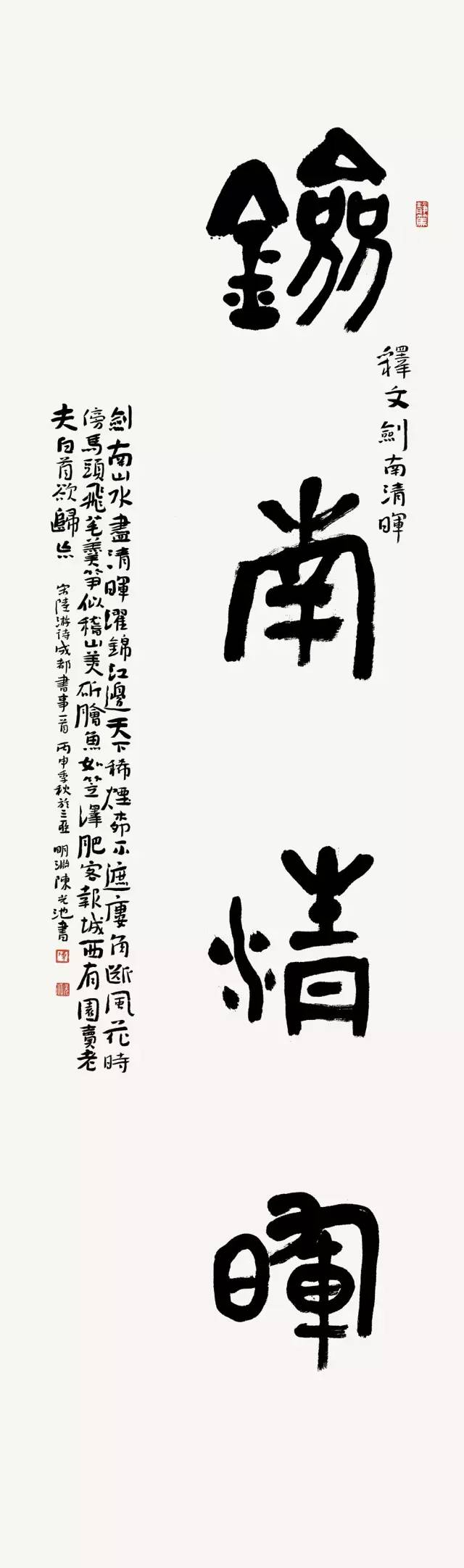 前言 宽襟堂,六同道。二山东,两海南,双新疆。五湖四海,六人佳迹。六个男人,容貌堂堂、气宇轩昂;六种笔墨,或篆或隶或行或狂。宽襟壮怀,龙蛇飞扬。当此时也,山与海万里相拥,云与水携手联唱。 段氏之大篆,凿山之斧,浑朴刚毅,如见古人钟鼎;单氏之行草,惊蛇出洞,自出机柕,飘逸似赶考书生。全生老弟,小山吾友,皆属昆仑弄墨人。研习甘苦,尽在眼底,铁马冰河,白露秋风。海南欧阳飞,字如其人,翼之、逸之度若飞。更喜海军大校陈光池,耕云种月,诗酒花茶,六零后笔墨一新。 宽襟容天地,壮笔写华章。欲穷千里目,须看六人堂。 周涛