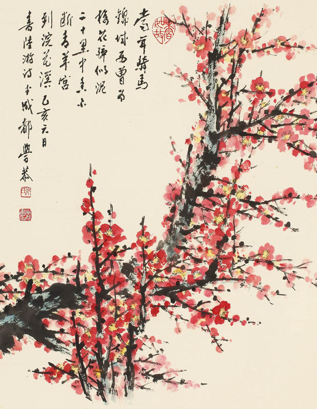 款识:当年骑马锦城西,曾为梅花醉似泥。二十里中香不断,青羊宫到浣花溪。乙亥元日书陆游诗于成都,学恭。