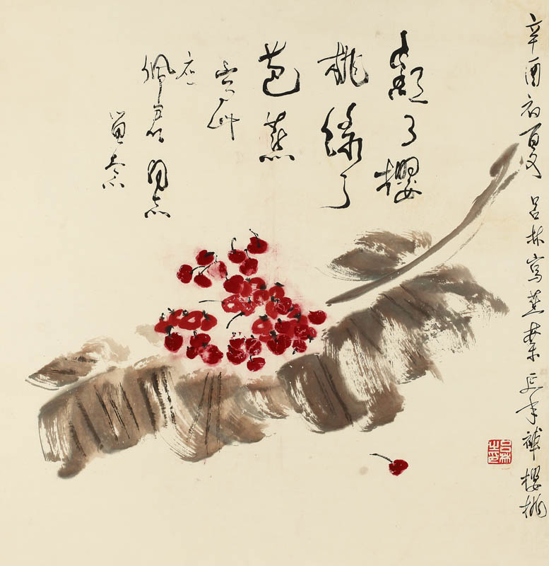 款识:红了樱桃绿了芭蕉,写此应佩君同志留念。辛酉初夏吕林写蕉叶延年补樱桃。