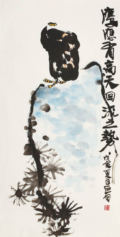 款识:鹰应有高天回流之势。戊寅夏日,巨白。