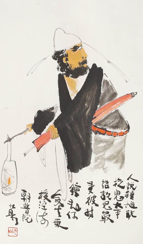 款识:人说钟馗能捉鬼,大年诰教鬼最多,彼时钟馗何处去,东授浮海朝普陀。九躬。