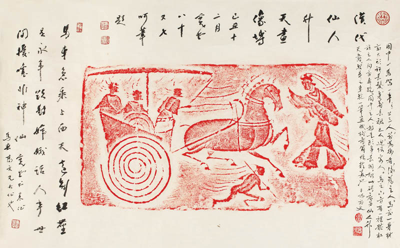 款识:汉代仙人升天画像砖。己丑十二月宽堂八十又七呵笔题。马车急乘上西天,远别红尘是永年,欲对嫦娥话人事,世间扰攘非神仙。宽堂书来作马春高文兄大作也。