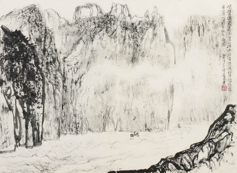 款识:峭壁倚天急湍腾,山雄水险唤诗魂。瞿塘浪接巫山浪,似箭风帆下西陵。黄纯尧写于乙亥。