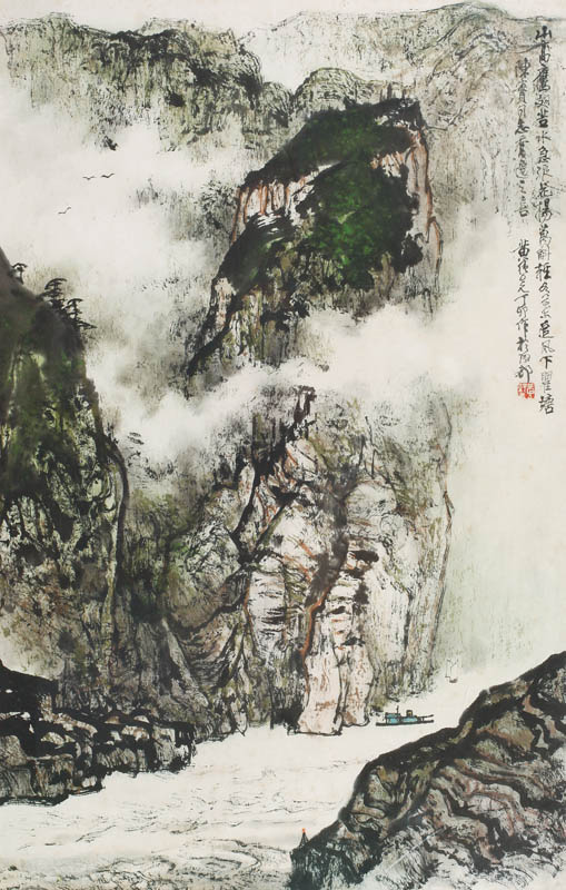 款识:山高鹰翅苦,水急浪花扬。万斛轻如叶,追风下瞿塘。陈实同志乔迁之喜,黄纯尧丁卯作于成都。