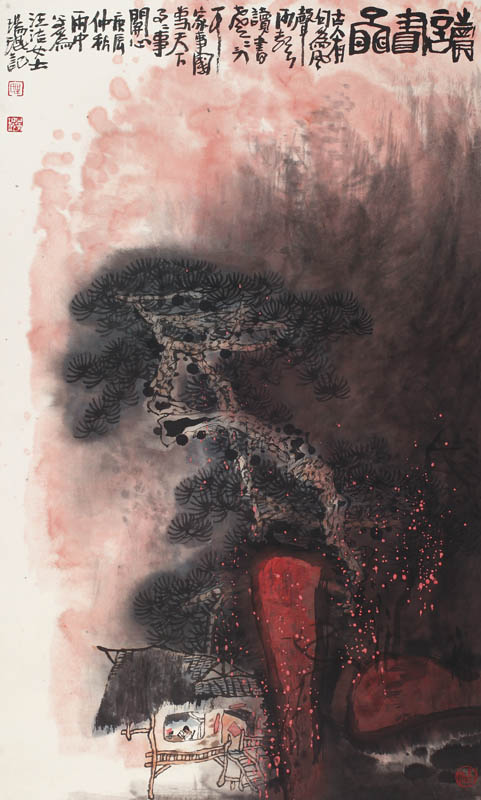 款识:读书图。古人有句为风声雨声读书声声声入耳,家事国事天下事事事关心。庚辰仲秋雨中写为汪洁女士,瑞琨记。
