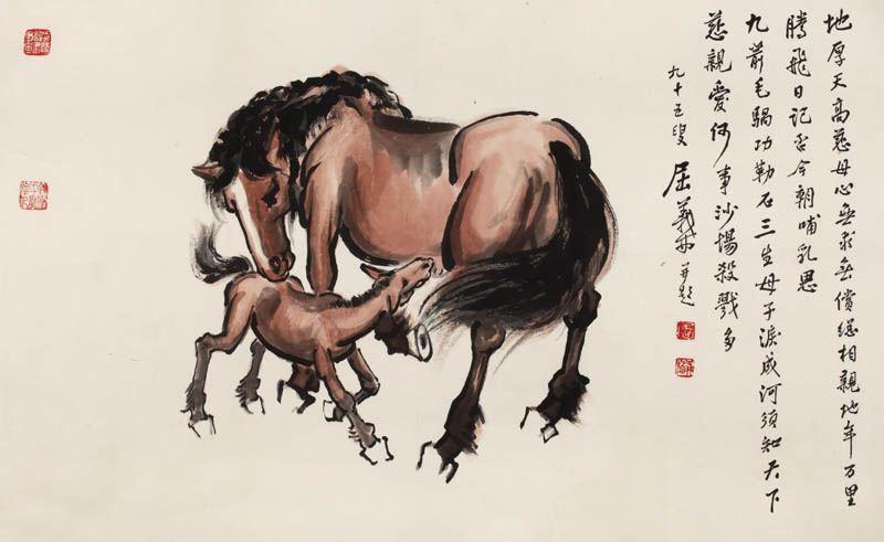 款识:地厚天高慈母心,无求无偿总相亲。他年万里腾飞日,记否今朝哺乳恩?九箭毛騧功勒石,三生母子泪成河。须知天下慈亲爱,何事沙场杀戮多。九十五叟屈义林并题。