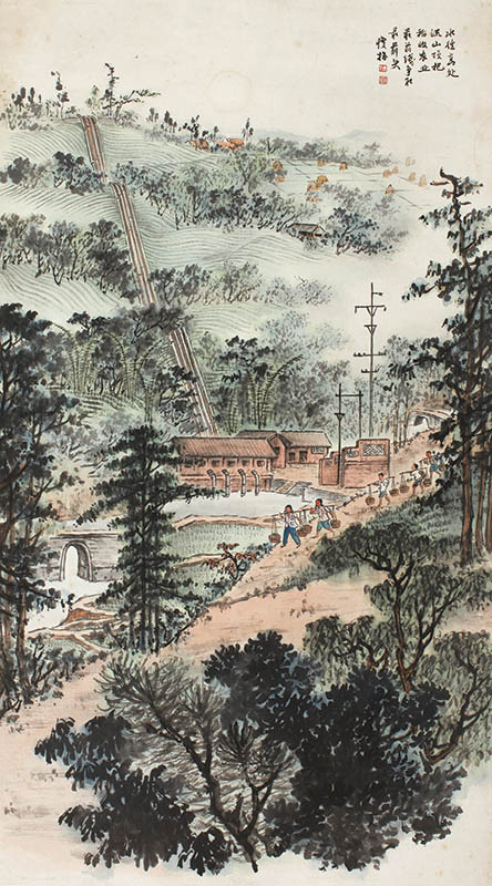 款识:水往高处流,山顶把稻收。农业最前线,争取最前头。瘦梅。