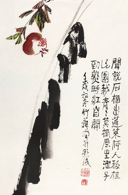 款识:闲就石榴出蓬莱,何人移植此园栽。青青莫摘原生涩,子到熟时红自开。壬戌初冬竹篱画并题识。