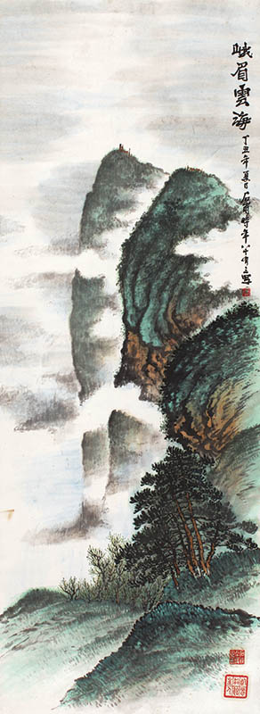 款识:峨眉云海。丁丑年夏日石甫时年八十有三写。