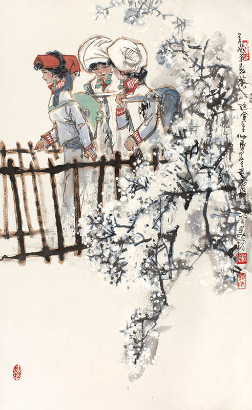 款识:羌寨春花。戊寅年夏写于重庆四川美院。