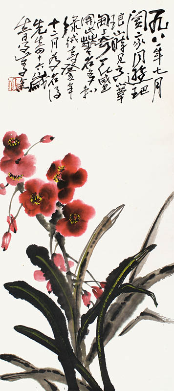 款识:一九八一年七月阖家同游吧琅山时见高山草匍上奇花盛开,此花名多剌绿绒寺。癸亥年十二月为名得先生四十六岁生日写此为念。