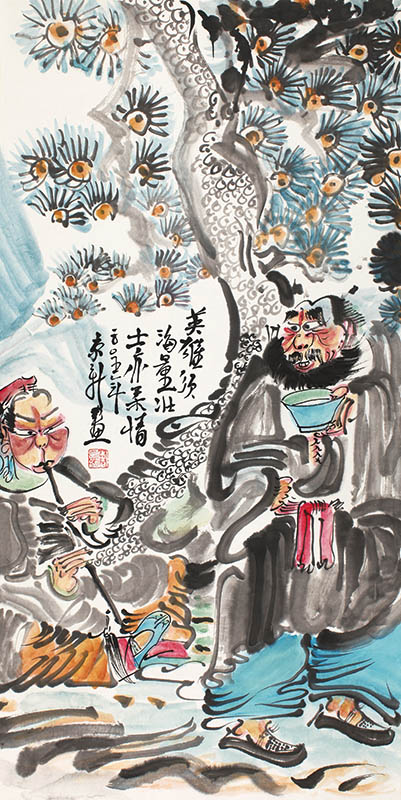 款识:英雄须海量,壮士亦柔情。二〇〇五京新画。
