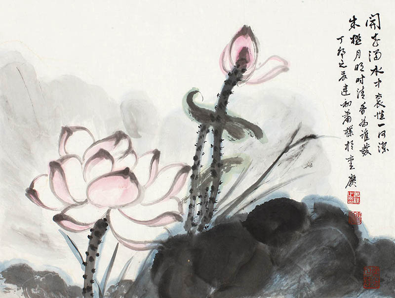 款识:开花浊水中,抱性一何洁。朱槛月明时,清香为谁发。丁卯之夏建初萧朴于重庆。