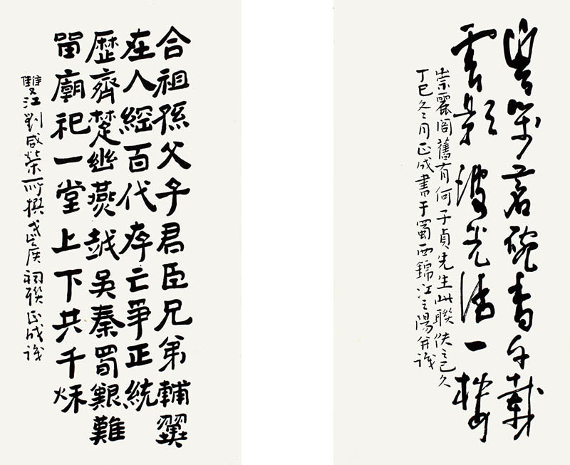 款识:1、双江刘咸荣所撰武侯祠联,正成识。2、崇丽阁旧有何子贞先生此联佚之已久,丁巳冬月正成书于蜀西锦江之阳并识。