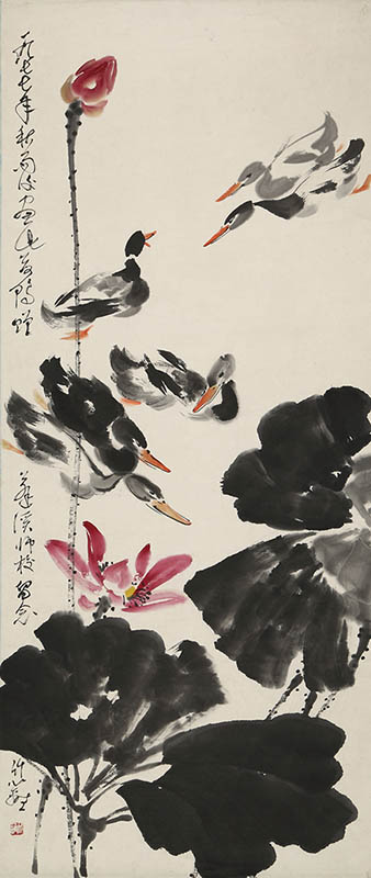 款识:一九七七年秋雨后画此荷鸭赠蓬溪师校留念竹篱