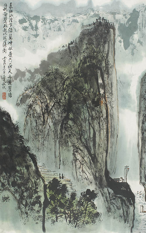 款识:长江汹涌下涪万,冲破夔门一线天。舟过瞿塘如放箭,惊魂起伏波涛间。黄纯尧辛巳年试纸。