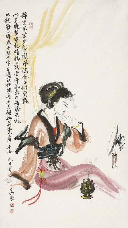 款识:锦里芬芳少佩兰,风流全占似君难。心迷晓梦窗犹暗,粉落香汗肌未干。两脸夭桃从镜发,一眸春水照人寒。自嗟此地非吾土,不得如花岁岁看。壬申人日写,真来。