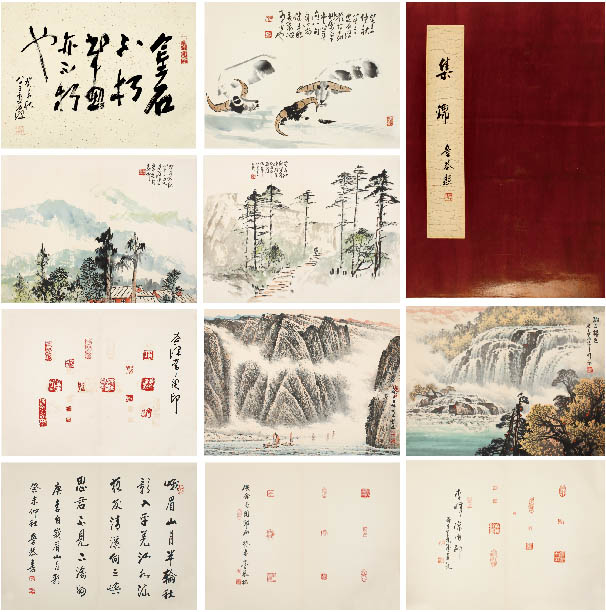 简介:岑学恭(1917-2009):满族,三峡画派创始人,中国美术家协会会员,国家一级美术师,四川省文史馆巴蜀诗书画研究会会长,四川省政协书画院副院长。以“岑三峡”之名响彻于世,为蜀中四老之一,现代巴蜀绘画史上之泰斗。李道熙(1920-2007):四川省犍为县人。嘉州画派创始人之一。中国美术家协会会员,曾任四川省文史馆员、北京中央书画院院士、四川乐山美协主席。 款识:封面:集锦。学恭题。1、癸未秋,八十三叟道熙。2、癸未仲秋八十三叟道熙于古嘉州紫气堂,时年逾八旬身心尚健手眼未衰,诚可喜也。3、癸未仲秋八十三叟道熙写旧稿于嘉州。4、癸未仲秋写旧稿峨眉山道中,道熙时年八十又三矣。5、道熙常用印。6、风帆出三峡。癸未,学恭。7、唐李白《峨眉山月歌》,癸未仲秋,学恭书。8、此余长用印也。癸未,学恭拓。9、树正秋色。岁在癸未年,李晖画。10、李晖常用印。岁在癸未年并记。 备注:1、金石不朽书画亦不朽也。7、峨眉山月半轮秋,影入平羌江水流。夜发清溪向三峡,思君不见下渝州。