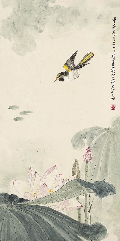 款识:甲子九月二十日,蕴玉戏写荷花小鸟。