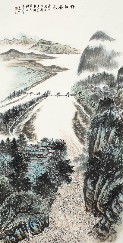 款识:都江春色。永山画友自渝来蓉相识留念,淛西吴一峰七十又四。