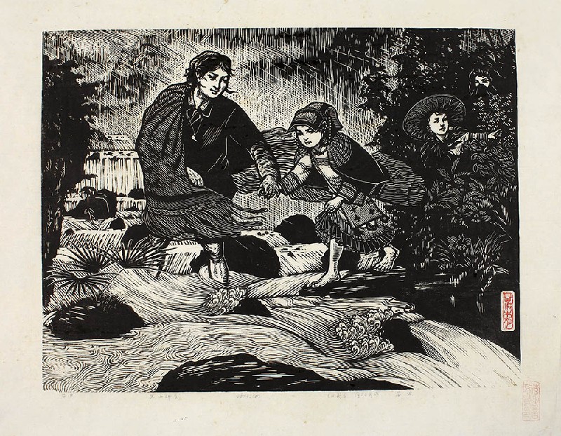款识:A.P,民小师生,46×34cm,(木刻)1964年作,苗波。