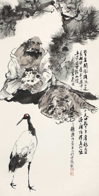 款识:尊者闭关锁深山,定中天地数十年。虎鹤左右长相伴,为求正道净心源。一朝悟得真如性,五浊恶世散如烟。庚寅岁次之秋,郭汝愚并句于云从阁。