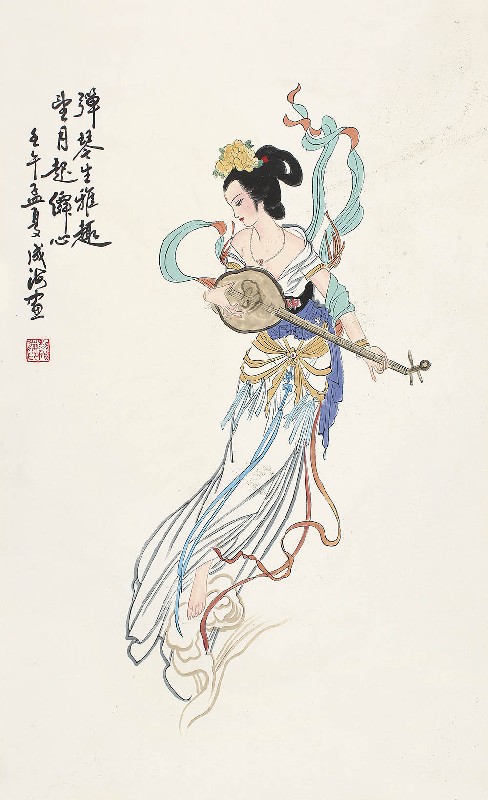 款识:弹琴生雅趣,望月起僲心。壬午孟夏成海画。