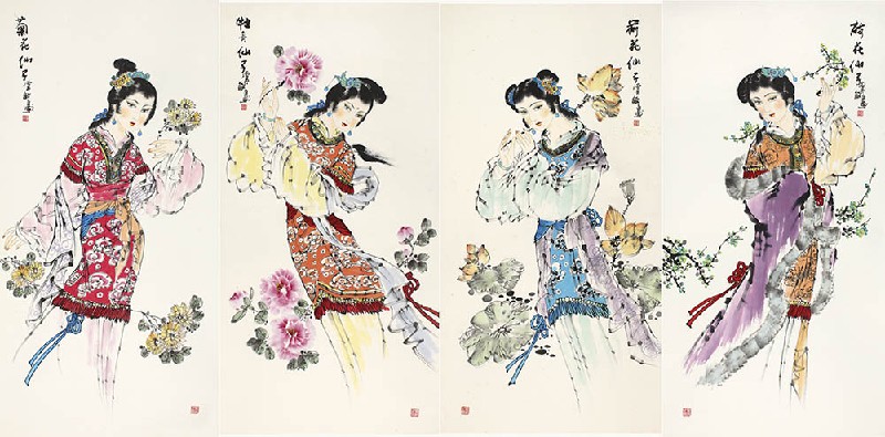 款识:1、菊花仙子,虞敏画。2、牡丹仙子,虞敏画。3、荷花仙子,虞敏画。4、梅花仙子,虞敏画。