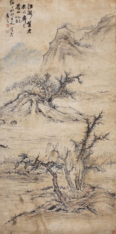 款识:江漪盘老树,晚霁见苍山。己巳四月,绥之仁仲大人望教,春芳。