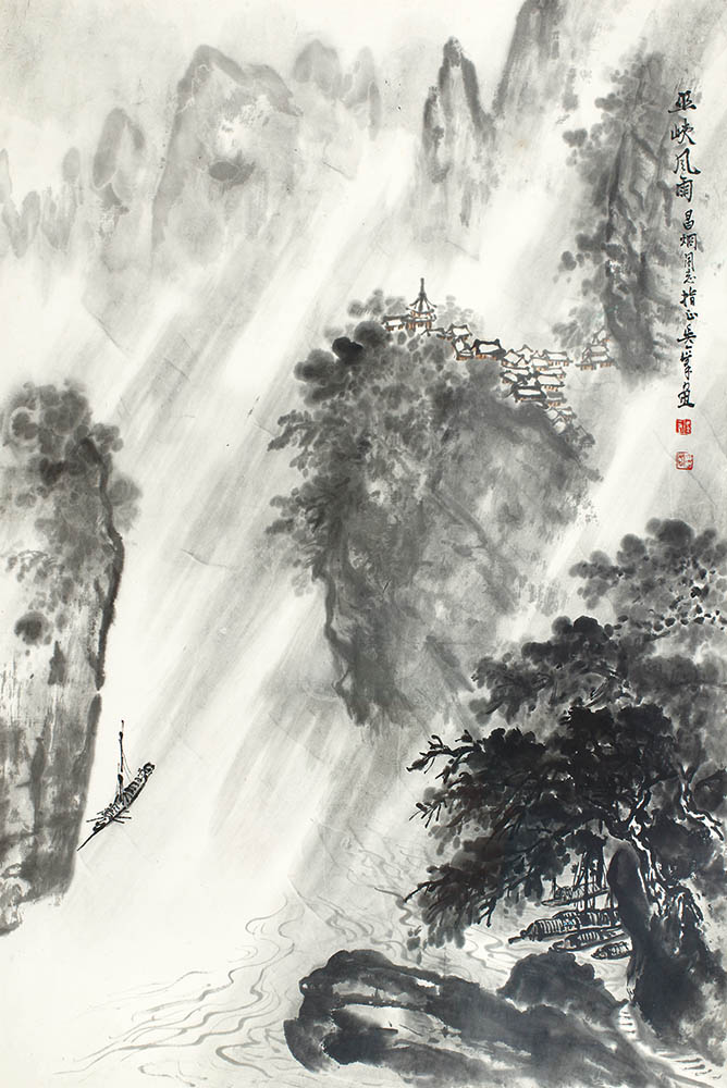 款识:巫峡风雨。昌炯同志指正,吴一峰画。