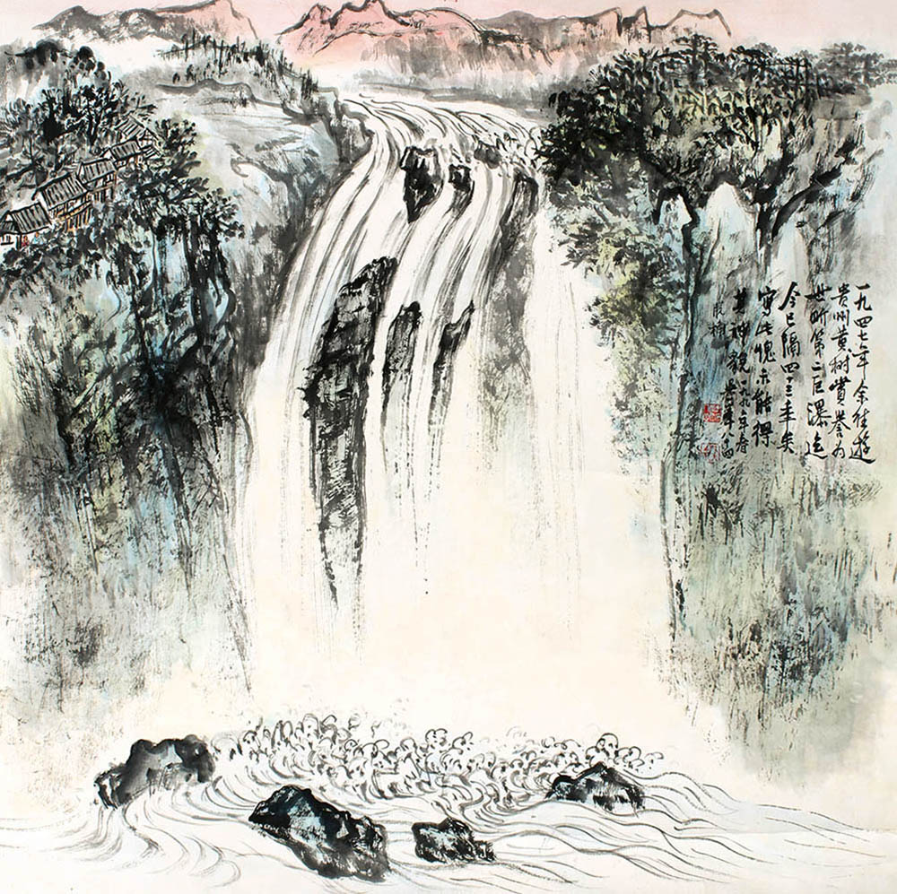 款识:一九四七年余往游贵州黄(脱桷)树,赏誉为世界第二巨瀑,迄今已隔四十三年矣。写此愧未能得其神貌。一九九一年春吴一峰年八十四。