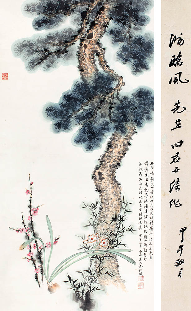 款识:幽径疏篱洗世尘,眼明见此数枝新。横斜恰受三更月,璀璨先回万物春。洛浦淩波矜绝态,缑山骑鹤想前身。放翁著句烦君记,画在生绡却未真。甲子三月白石道人谢临风。