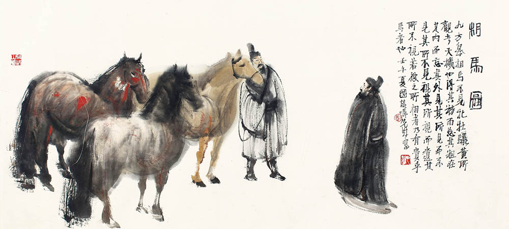 款识:相马图。九方皋相马,不见牝牡骊黄,所观者天机也。得其精而忘其粗,在其内而忘其外,见其所见而不见其所不见,视其所视而遗其所不视。若彼之所相者,乃有贵乎马者也。壬午夏,国超嘱,先诚写。