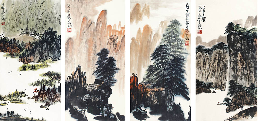 款识:1、己卯寿岳。2、丙戌之秋于锦里,寿岳。3、己丑之夏,寿岳写意。4、庚辰,寿岳。
