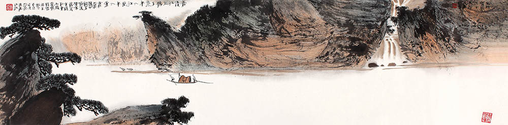 款识:嘉陵江上号子飞,半入江风半入云。壬辰大暑阆中归来忆写昔年旧写生稿于东山凤凰嘴,惜当年木船今已不见踪影。其鑫并记。必有贤弟七十大寿,其鑫恭贺。