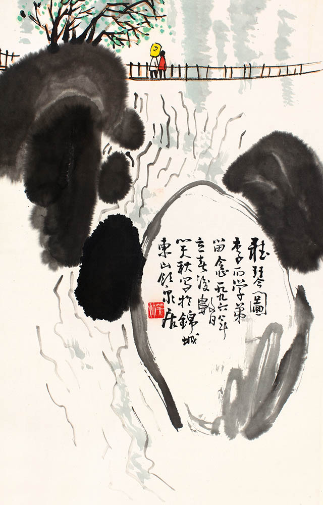 款识:听琴图。李石学弟留念,一九九六年立春后数日笑秋写于锦城东山饮泉居。